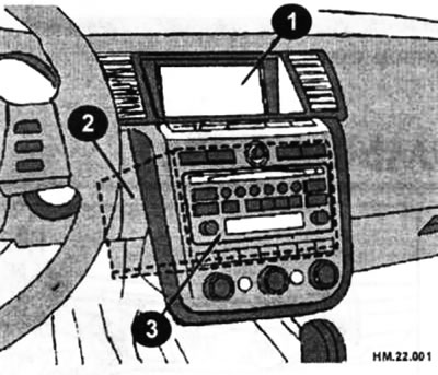 1 - дысплей; 2 — галаўная прылада аўдыёсістэмы; 3 - перамыкачы кіравання аўдыёсістэмай і кандыцыянерам.