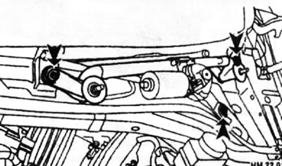 - Адкруціце балты мацавання электрарухавіка і цяг шклоачышчальніка (стрэлкі) і зніміце электрарухавік з цягамі.