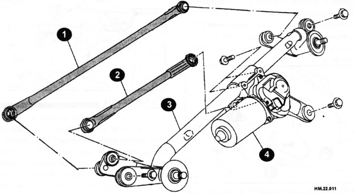 1 — цяга шклоачышчальніка №1; 2 - цяга шклоачышчальніка №2, 3 - рама шклоачышчальніка; 4 - электрарухавік шклоачышчальніка.