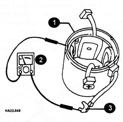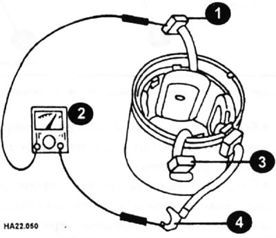Шпулькі ўзбуджэння можна праверыць омметрам (2), падлучыўшы яго паміж кантактам шпулькі (3) і корпусам статара (1), як намалявана на малюнку. Пры гэтым правяраецца, не замкнёная ці полюсная шпулька на "масу": Калі омметр паказвае супраціў, корпус статара з полюснымі шпулькамі трэба замяніць.