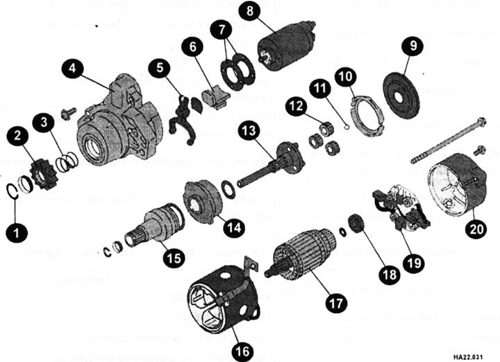 1 - стопорное кольца; 2 - шасцярня; 3 - спружына; 4 - пярэдняя крышка; 5 - рычаг прывада; 6 - упор; 7 - пракладка; 8 - саленоід; 9 - шайба; 10 - устаўка; 11 - шарык; 12 - планетарная перадача; 13 - вал-шасцярня; 14 - шасцярня ўнутранага зачаплення; 15 - обгонная муфта; 16 статар; 17 - якар; 18 - падшыпнік; 19 - шчоткатрымальнік; 20 - задняя вечка.