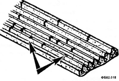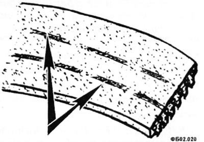 Паверхня рамяня зношаная і адслойваецца. Корд рамяня пачынае разбурацца, што прыводзіць да разрыву рамяня. Калі паверхня рамяня хутка псуецца або з'яўляюцца шчарбіны (стрэлкі), праверце жолаб шківа на наяўнасць шчарбін.