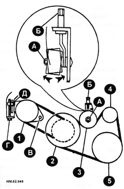 1 - шкіў помпы гідраўзмацняльніка руля; 2 - шкіў каленчатага вала; 3 - нацяжны ролік; 4 - генератар; 5 - кампрэсар кандыцыянера.
