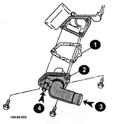 1 - пракладка; 2 - уваходны патрубак для астуджальнай вадкасці ў зборы з тэрмастатам; 3 - ад радыятара; 4 - ад алейнага радыятара.