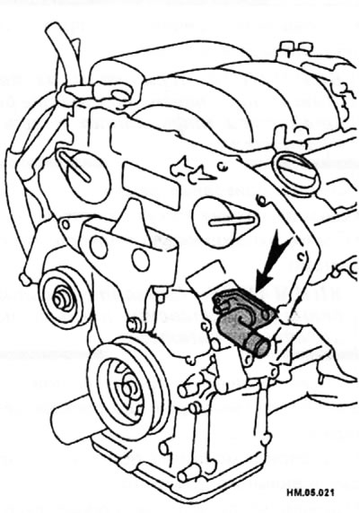 - Зніміце ўваходны патрубак для астуджальнай вадкасці ў зборы з тэрмастатам (стрэлка).