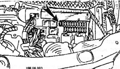 - Зніміце засцерагальнік паліўнай помпы (стрэлка), размешчаны ў блоку засцерагальнікаў.
