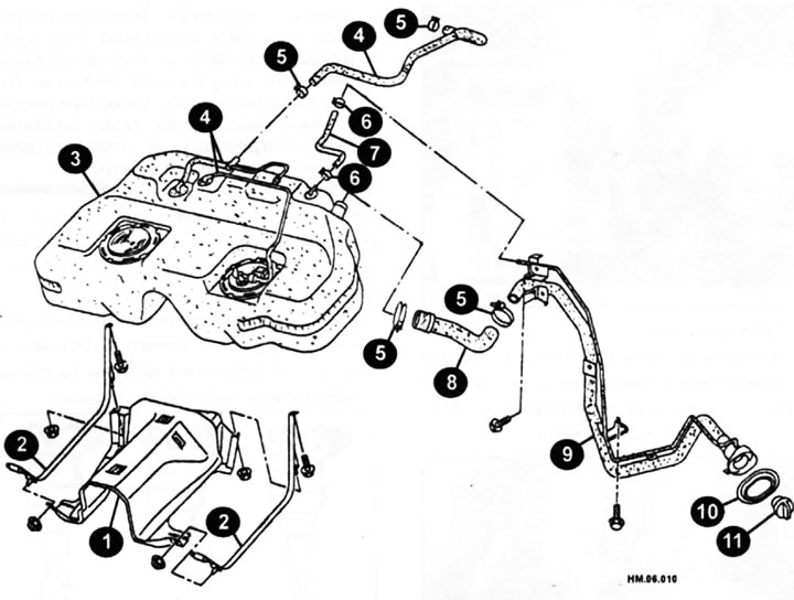 1 - зашытая паліўнага бака; 2 - стужка мацавання паліўнага бака; 3 - паліўны бак; 4 - шланг вентыляцыі паліўнага бака; 5, 6 - хамут шланга; 7 - шланг рэцыркуляцыі пароў паліва; 8 - шланг паліўнага бака; 9 - труба для запаўнення палівам; 10 - утулка; 11 - вечка паліўнага бака.