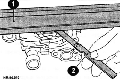 - Устаўце абедзве шасцярні ў помпу і вымерайце восевы зазор паміж верхняй часткай корпуса помпы і верхнім бокам шасцерняў, прыклаўшы сталёвую лінейку (1, і вымераючы вымяральным мацам (2), як намалявана на малюнку.