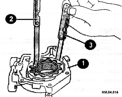 - Устаўце вузкі вымяральны мац (3) паміж вонкавым бокам вонкавай шасцярні і адтулінай корпуса (1). Зазор не павінен перавышаць 0,26 мм. Выкананне гэтага вымярэння паказана на рысунку. На гэтым малюнку намалявана таксама вымярэнне зазору паміж прылеглымі зубцамі (2). Гэты зазор павінен быць не больш за 0,1 8 мм.
