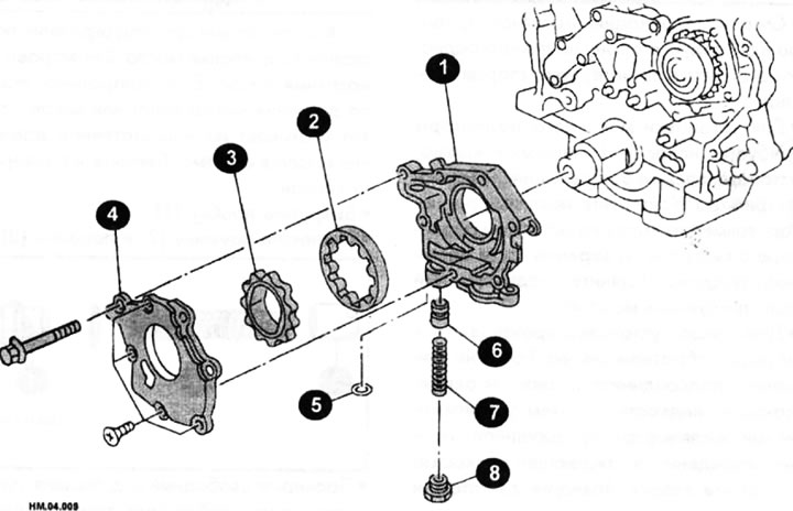 1 - корпус алейнай помпы; 2 - вонкавая шасцярня; 3 -~ унутраная шасцярня; 4 - крышка алейнага помпы; 5 - ушчыльняльнае кольца; 6 - рэдукцыйны клапан; 7 - спружына;8 - корак рэдукцыйнага клапана.
