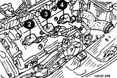2 - шпулька запальвання цыліндру №2; 3 - шпулька запальвання цыліндру №4; 4 - шпулька запальвання цыліндру №6.