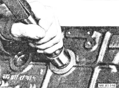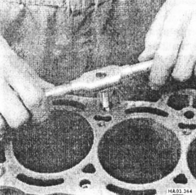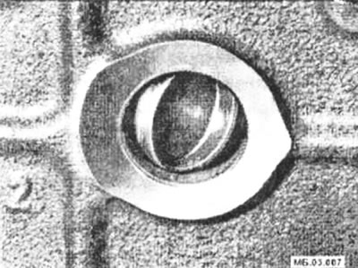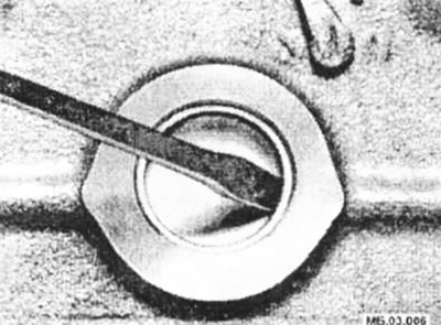 - Выцягнеце ўсе разьбовыя заглушкі алейных каналаў. Звычайна яны не выкручваюцца, і іх даводзіцца высвідроўваць. Пакуль заткніце адтуліны анучамі, а пры зборцы пастаўце новыя заглушкі.