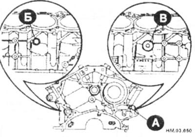 - Вырабіце не які дубянее герметык на разьбовыя заглушкі (А), (Б) і (У) і закруціце іх у адтуліны ў блоку цыліндраў патрабаваным момантам.
