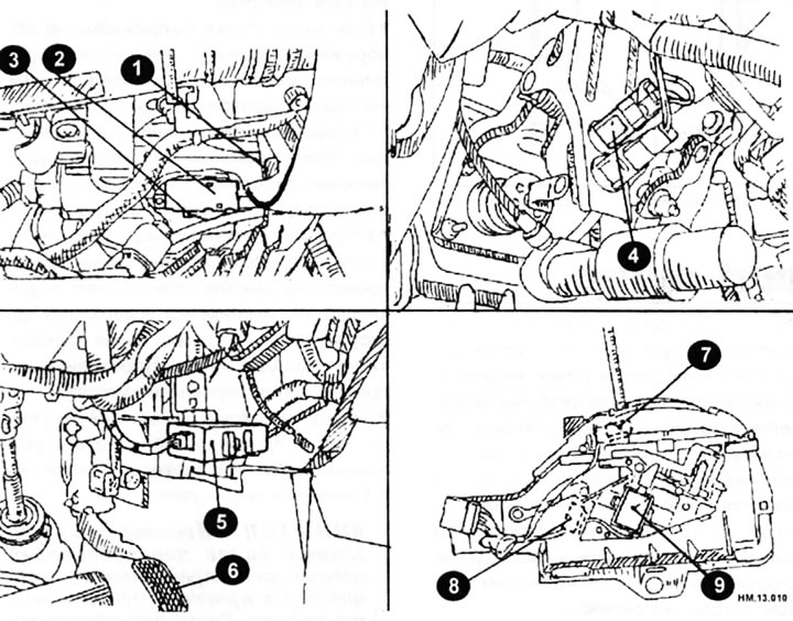 1 - выключальнік (замак) запальвання; 2 - саленоід блакавання ключа запальвання; 3 - аварыйны рычаг; 4 - выключальнік сігналу тармажэння; 5 - блок кіравання блакіроўкай пераключэння; 6 — педаль акселератара; 7 - выключальнік затрымкі (ключ запальвання); 8 - выключальнік затрымкі (пераключэнне); 9 - саленоід блакавання пераключэння.