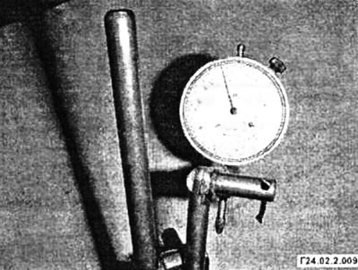 - Усталюйце стрелочный індыкатар на паверхню злучальнага фланца (з унутранага боку адтулін для нітаў мацавання карданнага вала). Для праверкі біцця правярніце злучальны фланец.