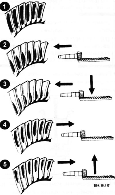 1 - правільны кантакт зубцоў; 2 - моцны кантакт зубцоў, зрушэнне да цэнтра. Перасуньце вядучую шасцярню далей ад вядзёнай шасцярні; 3 - моцны кантакт канцоў зубцоў. Перасуньце вядучую шасцярню ад вядзёнай шасцярні, а вядзёную шасцярню ад вядучай; 4 - моцны кантакт задніх частак зубцоў і зрушэнне да цэнтра. Перасуньце вядучую шасцярню да вядзёнай шасцярні. 5 - моцны кантакт задніх частак зубцоў з асабовага боку. Перасуньце вядучую шасцярню да вядзёнай шасцярні, а вядзёную да вядучай.