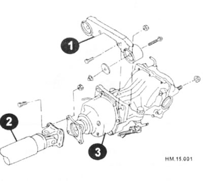 1 — кранштэйны мацавання галоўнай перадачы; 2 - задні карданны вал; 3 - задняя галоўная перадача.