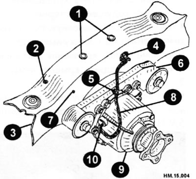 - Зацягніце гайкі мацавання галоўнай перадачы да бэлькі задняй падвескі момантам 68-87 Н·м, ніт мацавання кранштэйна да бэлькі задняй падвескі - момантам 75-94 Н·м, гайку мацавання кранштэйна - момантам 56-70 Н·м.